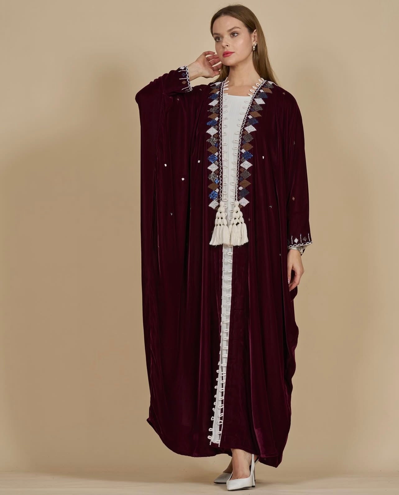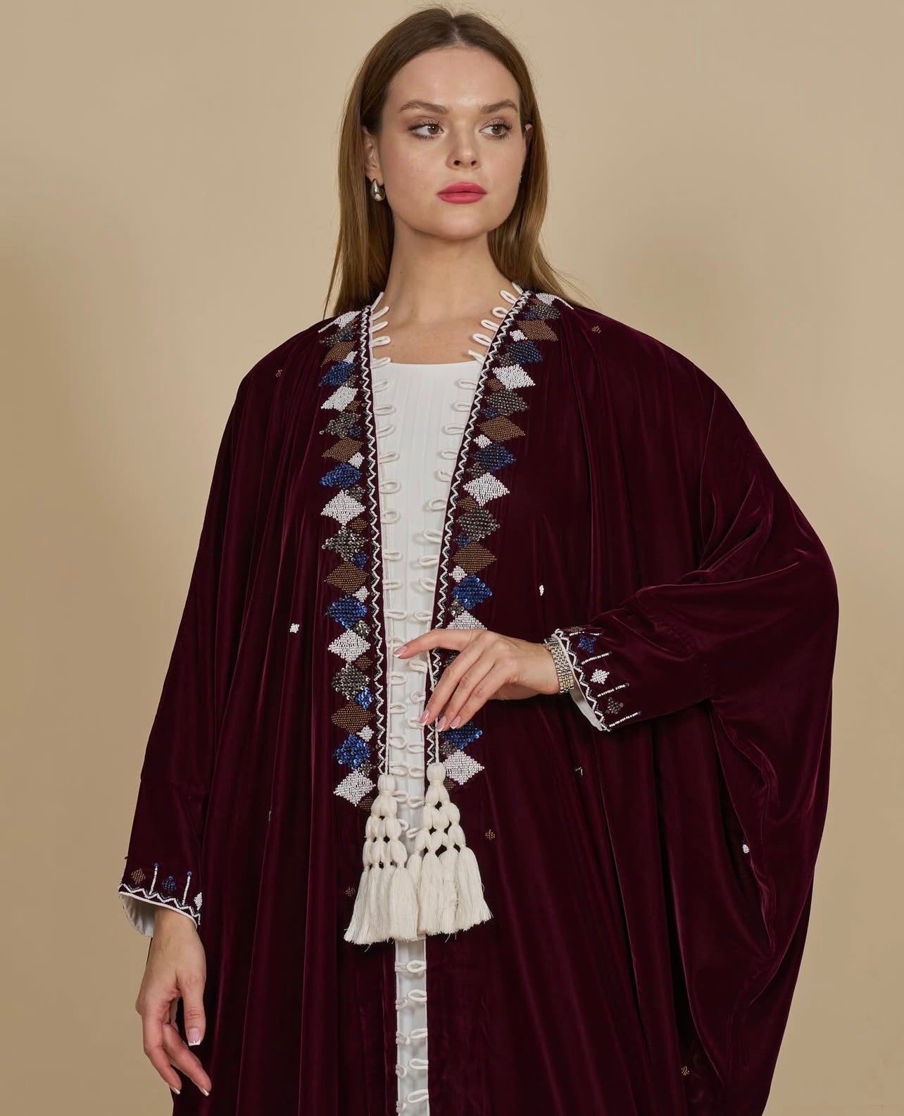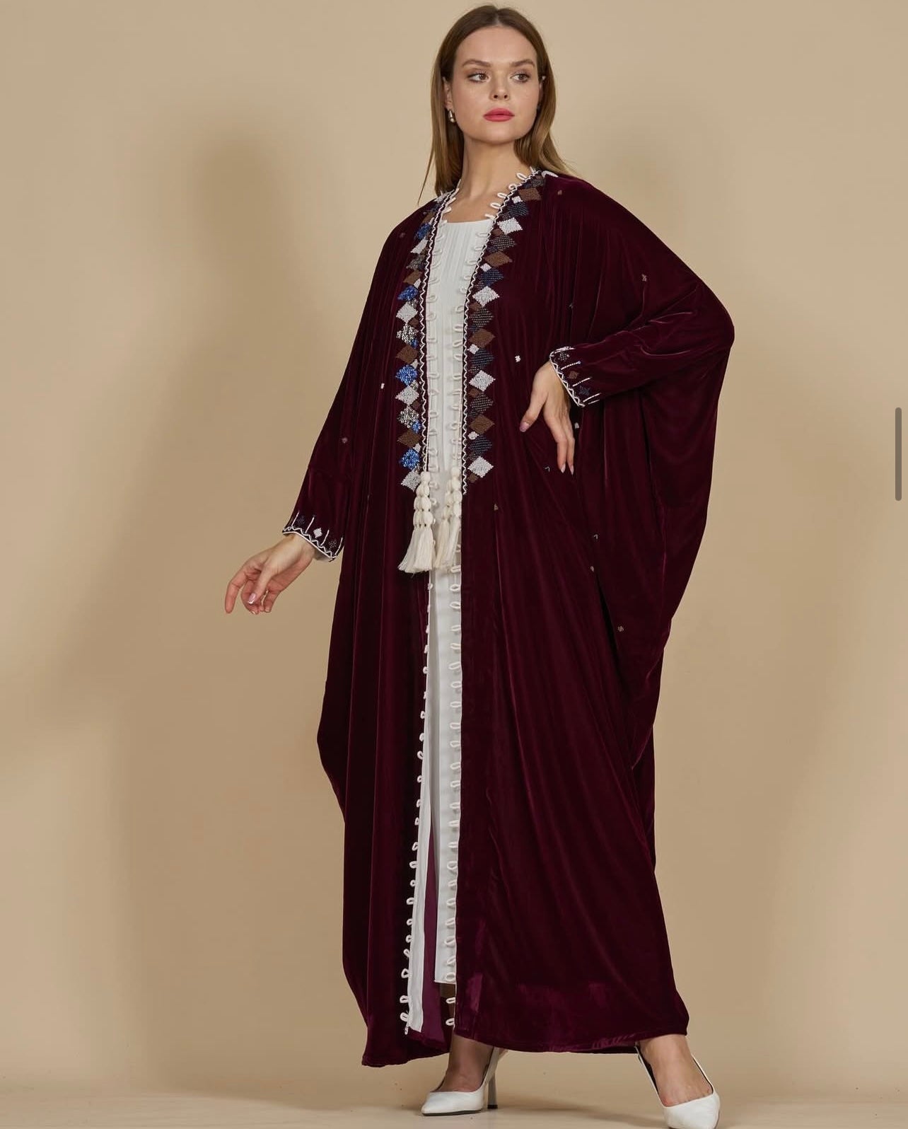 خامة مخملية مطرزة تطريز يدوي وتصميم عصري يليق بكل إطلالة. سهلة التنسيق وتجمع بين الأناقة والأنوثة في كل تفصيل